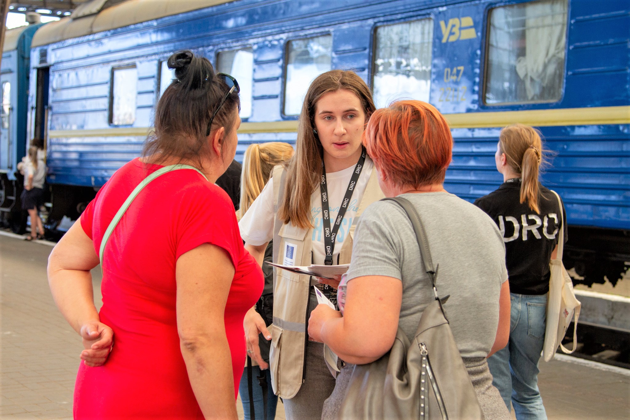 Banegården i Lviv er et vigtigt knudepunkt for folk, der enten forlader eller vender tilbage til Ukraine fra Polen. Derfor er det også et af de steder, hvor vi er til stede med juridiske rådgivere og ekspertise i beskyttelse for at tilbyde assistance til de mennesker, der har brug for hjælp eller vejledning.
